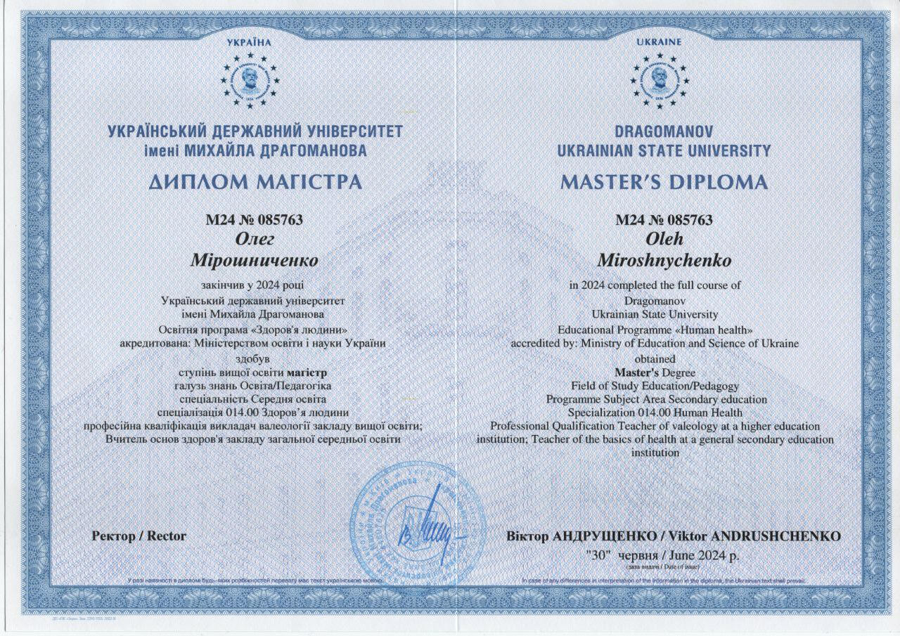 I hold a Master’s Degree in Human Health from Dragomanov Ukrainian State University (2024).This qualification provides the scientific foundation behind OM Method, adding depth to more than 30 years of hands-on practice.For you, this means every session is rooted in both solid academic knowledge and decades of real-world experience — giving you the confidence that your body is in expert hands.